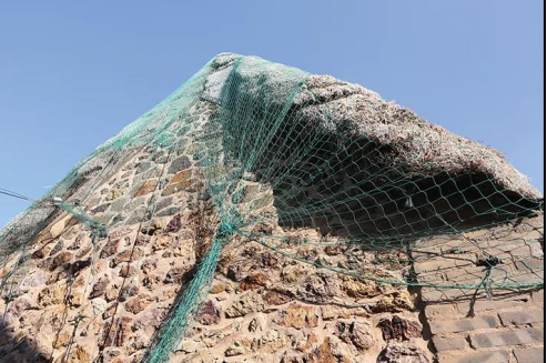 为了能起到保暖防晒的作用,海草房的房顶必须要突出一个“厚”字,老一辈人修建海草房,一层稻草秸秆一层海草,这样夏天的太阳晒不透,冬天的风吹不进来,真正实现冬暖夏凉。一座海草房使用时间的长短,主要取决于海草是否苫的严密。一个工匠完成一座海草房屋顶的苫盖,往往需要一个多月的时间。苫好的屋顶层层海草堆叠向上,舒缓而均匀地铺在尖尖的屋顶上,质感蓬松。屋脊的两头微微翘起,像是一个个硕大的马鞍。为了防止海风将屋顶的海草刮坏,有些居民还会在草顶上再罩上一层破旧的渔网,并用小件的重物作坠子坠住四角,使得海草房更富渔家特色。