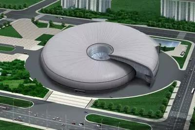 建筑外形呈鹦鹉螺形状,直径约92-98米。屋面以钢结构加金属板为骨架配以灰色金属屋面系统,将传统的海洋展示内容与现代的高科技相互融合,给城市以崭新的视觉享受。