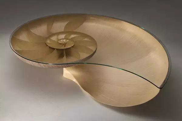 这张桌子外形酷似鹦鹉螺的外壳(鹦鹉螺的外壳不管多大,都遵循经典的黄金比例),将计算机辅助设计技术和创新的建造技术融为一体,把4000多片胡桃木和美国梧桐木薄片叠加拼接在一起,制作出了对数螺线的外形。