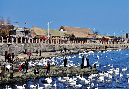 烟墩角村位于荣成市俚岛镇,是个依山傍海的小渔村。小村的东面有一座崮山,像一面墙遮挡着黄海的风浪。海水绕过崮山脚,在村南面形成一弯月牙形的避风港。每年冬天,数千只大天鹅就在村前的这片海湾里越冬,使这个小村闻名遐迩。“住海草房,吃渔家饭”成为烟墩角村的旅游特色。